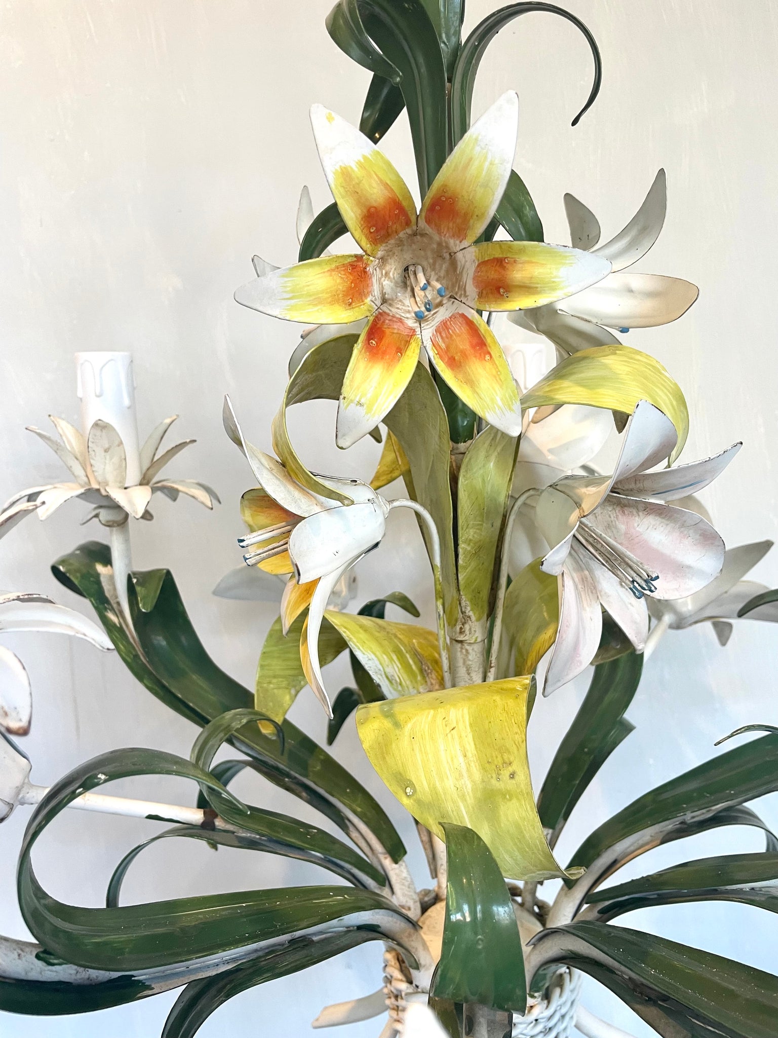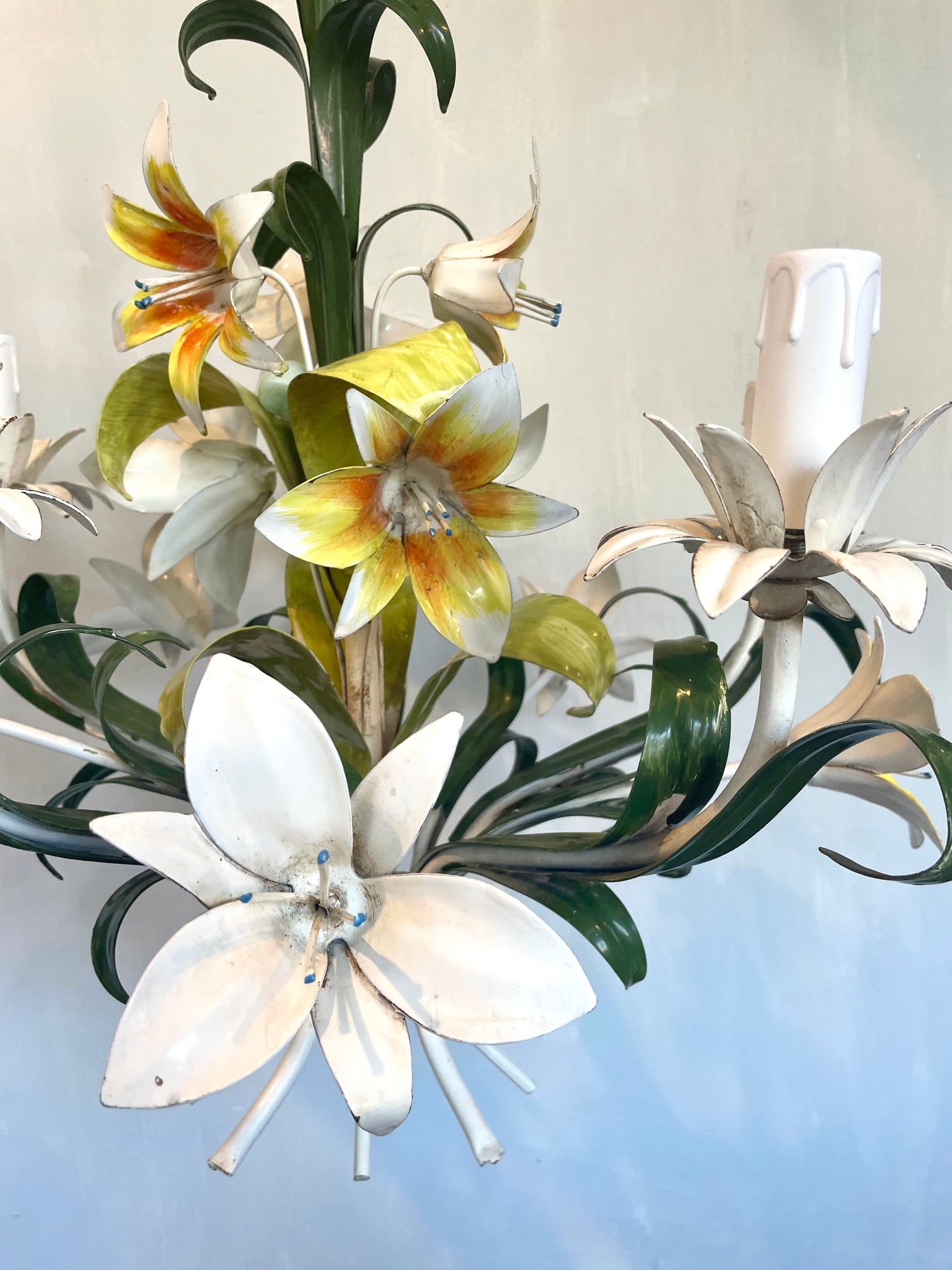 A magnificent, large 1950s five-arm Italian Tole chandelier with its original tag featuring hand-painted yellow, white & soft-pink lillies with long green fronds, a scalloped ceiling rose and leaf drip-trays.  The chandelier is in excellent condition and has been fitted with new E12 bulb holders & sleeves.